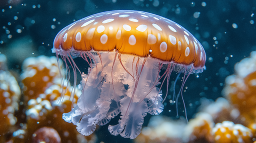 WonderMuralOva zavodljiva muralna tapeta prikazuje veličanstvenu narančastu meduzu s bijelim točkama, koja se veličanstveno lebdi u vodenom okruženju. Prozirn...