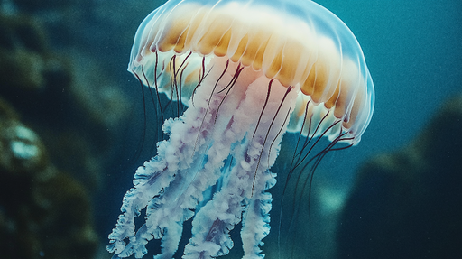 WonderMuralOva muralna tapeta prikazuje fascinantnu meduzu koja graciozno pluta u dubokom i misterioznom oceanu. Delikatne nijanse plave i narančaste evociraj...