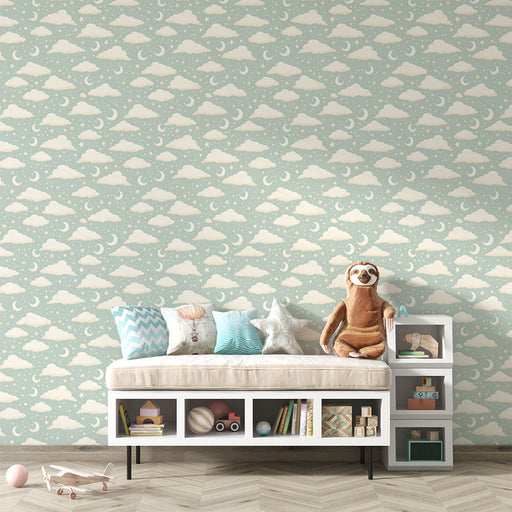 WonderMuralOva tapeta prikazuje šarmantni motiv pahuljastih oblaka i polumeseca na umirujućem pastelno plavom pozadini. Oblaci, oslikani u krem tonovima, njež...