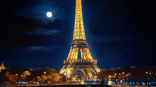 Prikaži sve detaljeTapeta Eiffel Tower noću | Zlatno osvjetljenje pod mjesecom
