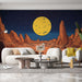 Ova tapeta prikazuje fascinantan pustinjski krajolik s impozantnim stjenovitim formacijama, osvijetljenim ogromnim žutim mjesecom. Grafička i stilizirana umjetnost nudi ambijent koji je istovremeno tajanstven i živahan, prenoseći vaš interijer u očaravajući izvanzemaljski svemir.