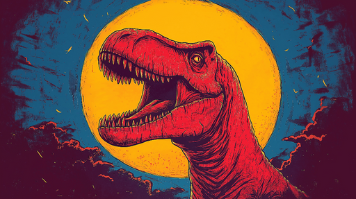 WonderMuralOva zanosna tapeta prikazuje veličanstvenog T-Rexa u živopisnim crvenim nijansama, ponosno stojeći pod svijetlom punog mjeseca. Tamne nijanse i bog...