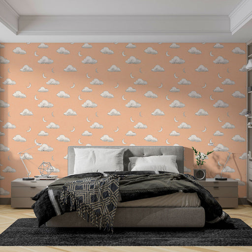 WonderMuralOva foto tapeta prikazuje šarmantan uzorak laganih oblaka i nježnih mjeseca na toplom koraljnom pozadini. Blage ilustracije, u nijansama sive, stva...