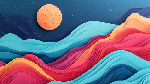 Prikaži sve detaljeApstraktni krajolik zidne tapete | Šareni valovi ispod narančastog mjeseca