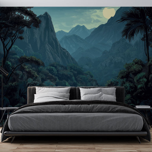 WonderMuralOva zanosna muralna tapeta prikazuje veličanstveni planinski krajolik, obavijen bujnom šumom. Nijanse duboko zelene i plave dodaju mističnu atmosfe...