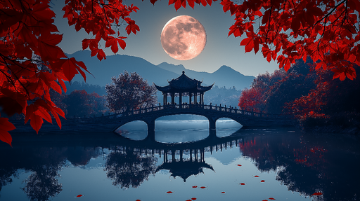 WonderMuralOva tapeta evocira spokoj noćnog krajolika, prikazujući tradicionalni most koji se ogleda u mirnim vodama jezera. Pun mjesec osvjetljava nebo, doda...