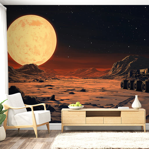 WonderMuralOva očaravajuća tapeta prikazuje vanzemaljski krajolik u toplim i svijetlim nijansama, s impresivnim roverom parkiranim ispod ogromnog zlatnog mjes...