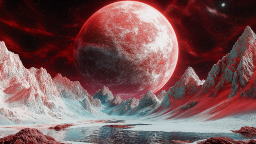 Prikaži sve detaljeSvemir tapeta | Nestvarni planinski krajolik pod crvenim mjesecom