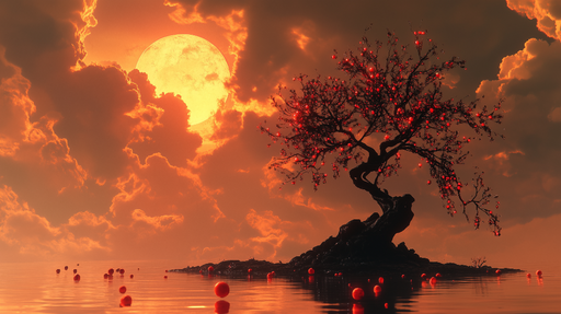 Art'loloOva magična muralna tapeta sumraka prikazuje očaravajući prikaz misterioznog drveta osvijetljenog nježnom svjetlošću mjeseca. Narančasto nebo dodaj...