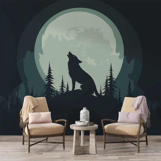 WonderMuralOtkrijte našu zanosnu tapetu s veličanstvenim vukom koji zavija prema mjesecu, okružen siluetama drveća u noćnom okruženju. Ova ilustracija podsjeć...