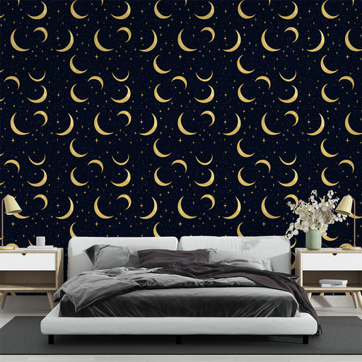 WonderMuralOtkrijte naš zanosni mural tapete koji prikazuje zlatne mjesece i sjajne zvijezde na dubokoj crnoj pozadini. Ovaj delikatan dizajn budi čaroliju no...