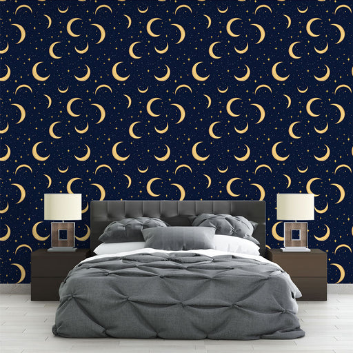 WonderMuralOvaj očaravajući mural tapeta prikazuje nježni uzorak zlatnih mjeseca okruženih sjajnim zvijezdama, sve postavljeno na duboku polumraku plavu pozad...