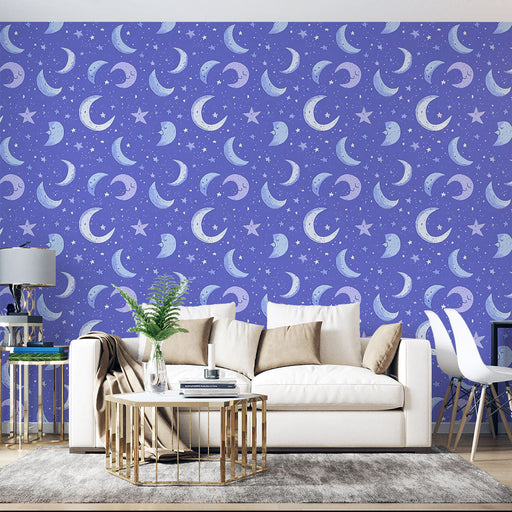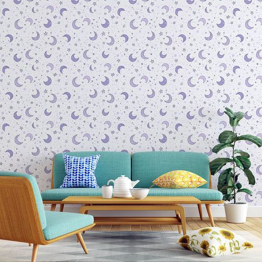 WonderMuralOvaj očaravajući mural s tapetama prikazuje zavodni uzorak mjeseca i zvijezda u ljubičastoj boji na svijetloj pozadini, stvarajući čarobnu i sanjiv...