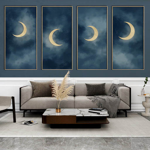 WonderMuralNaš originalni Tapete prikazuje nježno ilustrirani faze mjeseca motiv, koji pluta u oblačnom nebu s dubokim plavim tonovima. Zlatni tonovi mjeseca ...