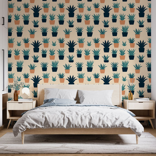 WonderMuralNaša tapeta prikazuje šarmantan uzorak zelenih kaktusa u svijetlim loncima, ponavljan na mekoj bež pozadini. Grafički oblici biljaka donose modern...