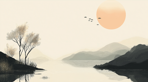 WonderMuralOva muralna tapeta nudi umirujući krajolik koji prikazuje siluete planina na horizontu, s nježnim drvećem i sjajnom površinom vode. Nježno izlazeće...