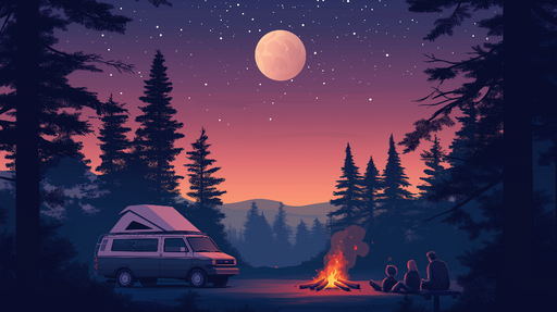 Prikaži sve detaljeKampiranje tapeta | Prizor zvjezdane noći s kombijem i logorskom vatrom