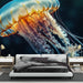 Ova muralna tapeta prikazuje fascinantnu meduzu koja graciozno pluta u dubokom i misterioznom oceanu. Delikatne nijanse plave i narančaste evociraju bioluminiscenciju, stvarajući umirujuću i zanimljivu atmosferu. Prozirna tekstura meduze, kombinirana s njenim dugim pipcima, donosi vodenjaku eleganciju u vaš unutrašnjost.