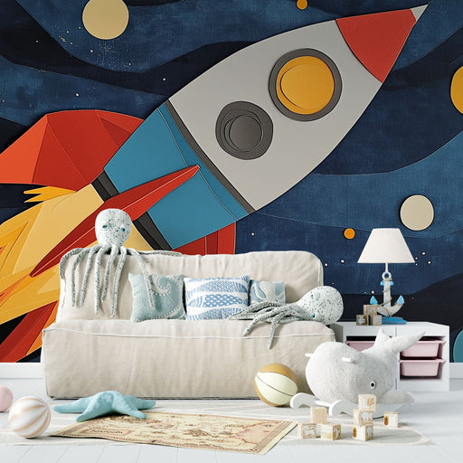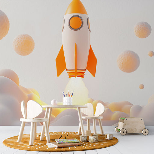 WonderMuralOva muralna tapeta prikazuje igružni uzorak rakete u punom lansiranju, okružene apstraktnim oblicima koji podsjećaju na planete i zvijezde. Svijetl...