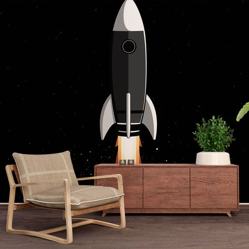 WonderMuralOva zavodljiva muralna tapeta prikazuje stiliziranu raketu koja izlazi u svemir, s svijetlim plamenovima koji izlaze iz njezinih motora. Duboka crn...