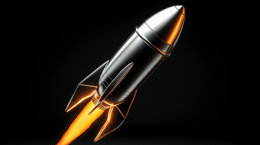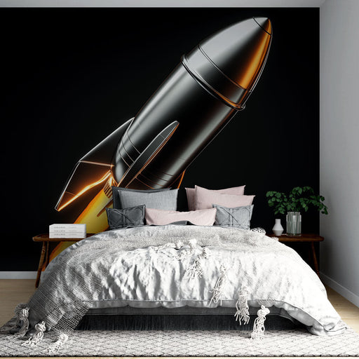 WonderMuralOva hrabra i moderna muralna tapeta prikazuje metalnu raketu s futurističkim linijama, osvijetljenu svijetlom plamenom u nijansama žarko narančaste...