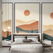 Naša originalna tapeta sadrži apstraktni planinski krajolik okupan nježnim, toplim nijansama. Valoviti oblici brda i vitke siluete drveća stvaraju umirujuću scenu, savršenu za unos daška spokoja u vaš interijer. Lebdeće narančasto sunce dodaje toplu i ugodnu atmosferu.