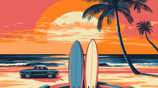 Prikaži sve detaljeTapeta sunset | Tropska plaža s daskama za surfanje i vintage automobil