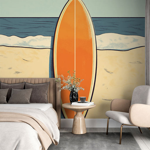 WonderMuralOva tapeta prikazuje ikonični safari na plaži, s narančastom daskom za surfanje koja stoji na zlatnom pijesku. Pozadina dočarava mirno more, s blag...