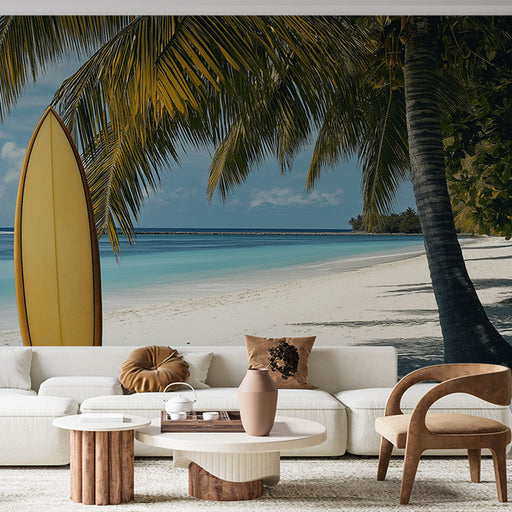 WonderMuralOva tapeta dočarava umirujuću tropsku atmosferu s prekrasnom daskom za surfanje naslonjenom na palmu, s pogledom na fine pješčane plaže. Mekane nij...