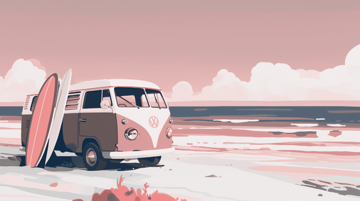 WonderMuralNaša tapeta prikazuje šarmantnu plažnu scenu, prikazujući retro surf kombi parkiran blizu vode, u pratnji surf dasaka. Nježne nijanse ružičaste i p...
