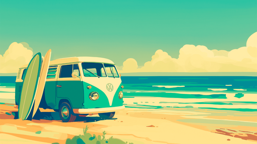 FluxGraphicPrizivajući bijeg i mir, ovaj tapet prikazuje idiličnu plažnu scenu, s vintage kombijem i surf daskama, spremnim za pomorsku avanturu. Blage nijans...