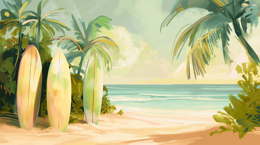Prikaži sve detaljeTapeta plaža | Tropska atmosfera s daskama za surfanje i palmama