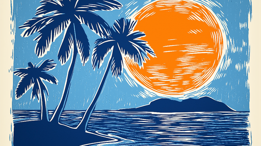 WonderMuralOvaj zanosni mural tapeta prikazuje ilustrirani tropski zalazak sunca, gdje žarko narančasta boja sunca harmonično se stapa s umirujućim nijansama ...