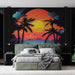 Ova zanosna tapeta uranja vas u tropsku atmosferu s šarenim zalaskom sunca koji osvjetljava nebo. Topli tonovi ružičaste, narančaste i žute harmonično se stapaju, dok siluete palmina stabla i planine stvaraju upečatljiv kontrast.
