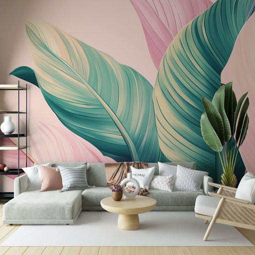 WonderMuralZaronite se u umirujuću atmosferu s ovom tapetom s bujnim uzorcima lišća. Pastelni tonovi, od nježne ružičaste do umirujuće zelene, stvaraju osjeća...