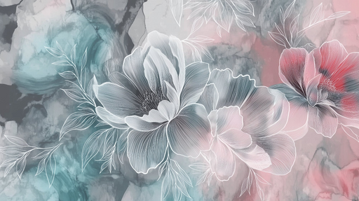Art'loloOva Tapeta s cvjetnim motivima prikazuje prekrasno cvijeće nacrtano bijelim linijama na pozadini u nijansama sive, plave i pastelno ružičaste boje....
