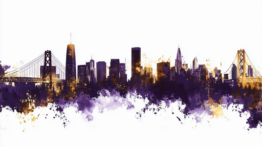 Art'loloOva tapeta s obrisom grada prikazuje zadivljujuću apstraktnu reprezentaciju grada s njegovim ikoničnim mostovima. Nijanse ljubičaste i zlatne dodaj...
