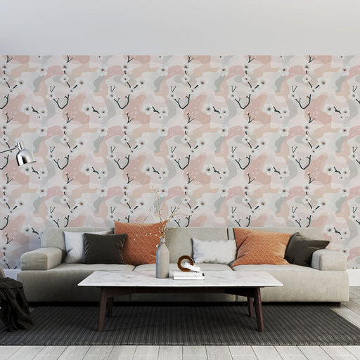 WonderMuralOva tapeta ima nježan dizajn bijelog cvijeća na pozadini s pastelnim nijansama, stvarajući meku i umirujuću atmosferu. Ružičaste, sive i kremaste t...