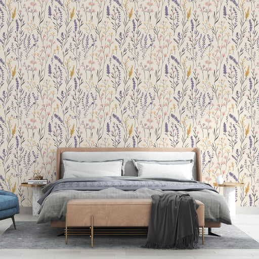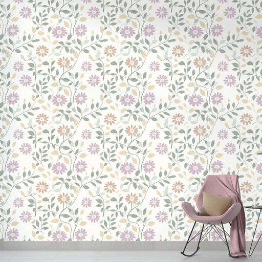 WonderMuralOva tapeta prikazuje elegantan uzorak pastelnih cvjetova i nježnog lišća, stvarajući meku i umirujuću atmosferu. Nijanse ružičaste, ljubičaste i žu...
