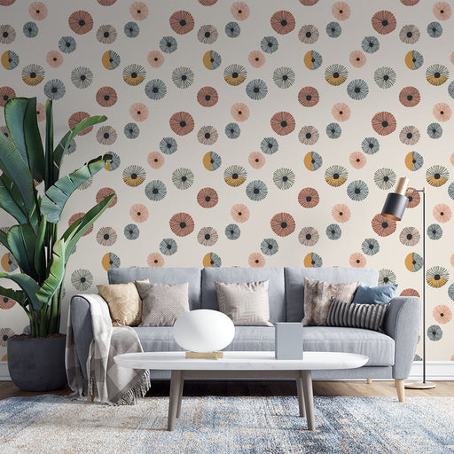 WonderMuralOva živopisna tapeta sadrži suvremeni dizajn stiliziranih cvjetnih uzoraka u toplim nijansama crvene, plave i zlatne boje na svijetloj krem podlo...