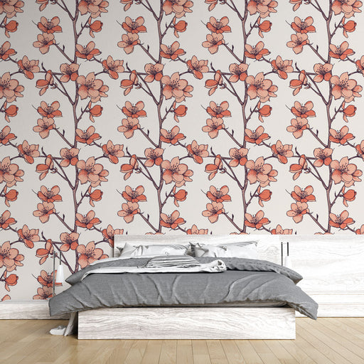 WonderMuralOva muralna tapeta prikazuje očaravajući uzorak cvjetnih grana s nježnim cvjetovima obojenim u breskvaste tonove. Svijetla pozadina naglašava nježn...