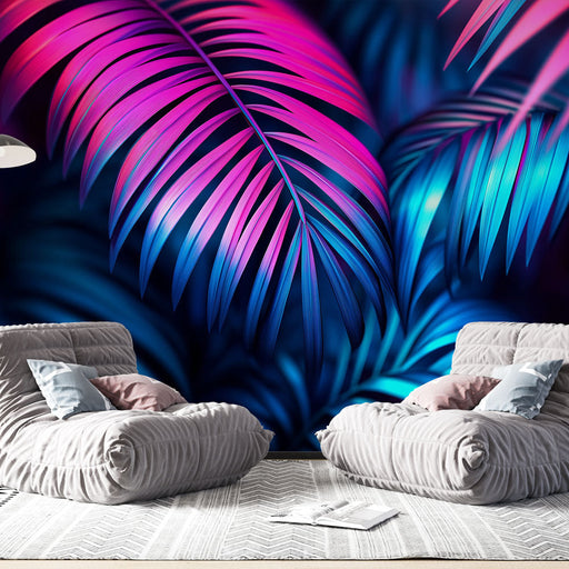 WonderMuralOtkrijte Foto Behang koji dočarava modernu džunglu zahvaljujući svojem hrabrom dizajnu, miješajući vibrantne nijanse ružičaste i plave boje. Listov...