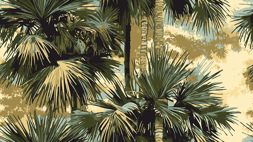 WonderMuralOva tapeta s muralom prikazuje živopisni uzorak tropskih palmi, ističući nijanse zelene, bež i dodire plave boje. Dinamična ilustracija stvara topl...