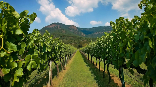 Art'loloOva Tapeta vinograda uhvaća ljepotu bujnih redova vinove loze koji se beskrajno protežu pod plavim nebom, s planinama u pozadini. Ovaj uzorak dodaj...