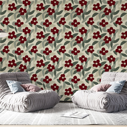 WonderMuralOva muralna tapeta prikazuje zadivljujući retro cvjetni uzorak u bogatim nijansama crvene boje na mekom kremastom pozadini, donoseći vječnu eleganc...