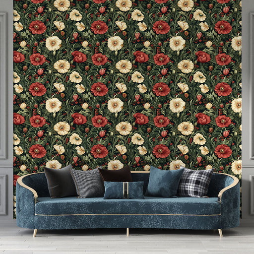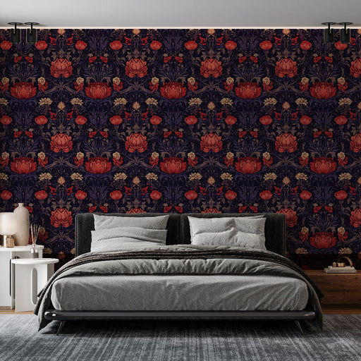 WonderMuralOva foto tapeta prikazuje veličanstveni cvjetni uzorak u crvenoj i crnoj boji, kombinirajući stilizirane cvjetove s nježnim lišćem. Tamna pozadina ...