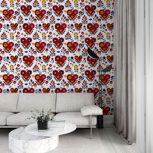 WonderMuralOva živopisna tapeta prikazuje divnu ponavljanje crvenih srca ukrašenih višebojnim cvijećem, stvarajući radostan i svečan efekt. Cvjetni uzorci, pr...