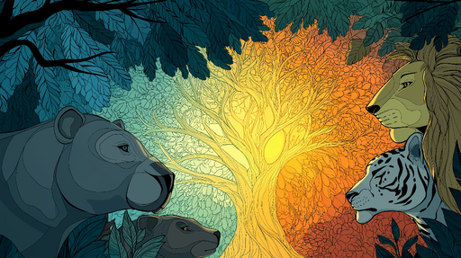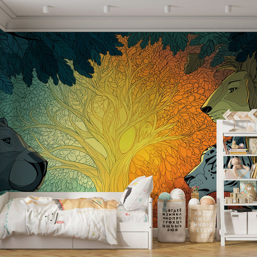 WonderMuralOvaj izvanredni mural tapete prikazuje moćno okupljanje divljih životinja, lavova, tigrova i medvjeda, ispred veličanstvenog drveta koje zrači sunc...