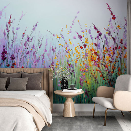 WonderMuralOva tapeta uhvaća suštinu divljih cvjetova u punom cvatu, nudeći šareni spektakl ljubičastih, narančastih i žutih boja na mekom i umirujućem pozadi...