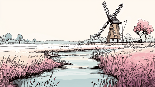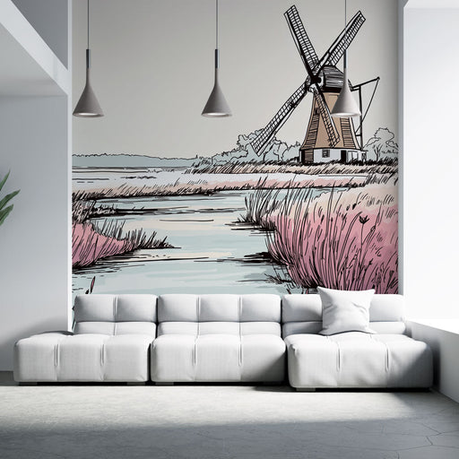 WonderMuralOva tapeta je prekrasan prikaz seoskog krajolika, s vjetrenjačom usred cvjetnih polja i mirnim potokom. Ružičasti i plavi dodiri stvaraju nježnu i ...